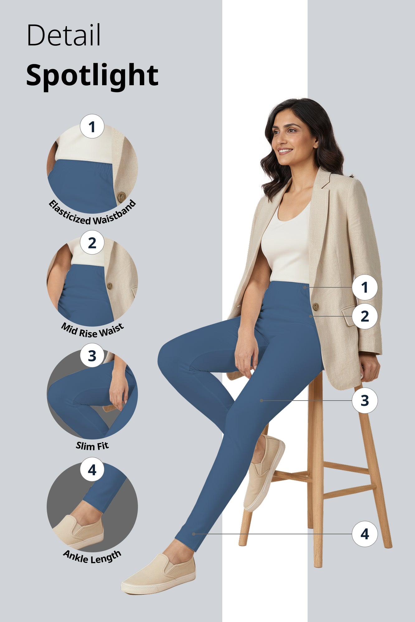 Inspired by the 16 Sanskaras, the Denim Ankle Length Leggings from Fabrika16 bring a contemporary and versatile touch to everyday wear. Made from soft, breathable cotton, these ankle-length leggings provide a sleek fit that moves comfortably with you. The classic denim blue shade adds subtle sophistication, making them perfect for pairing with ethnic or contemporary tops for casual, festive, or office occasions.