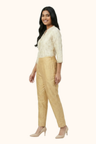 Radiate subtle elegance with the Light Gold Tussar Silk Pants from Fabrika16. Crafted from pure Tussar Silk, these pants reveal a rich texture and natural sheen that beautifully enhance this luminous, refined shade. Designed for the modern woman who appreciates tradition with a contemporary touch, they blend timeless Indian craftsmanship with a polished straight silhouette. Lightweight yet structured, this graceful hue transitions effortlessly from celebratory occasions to elevated daywear, offering understated glamour with effortless style.